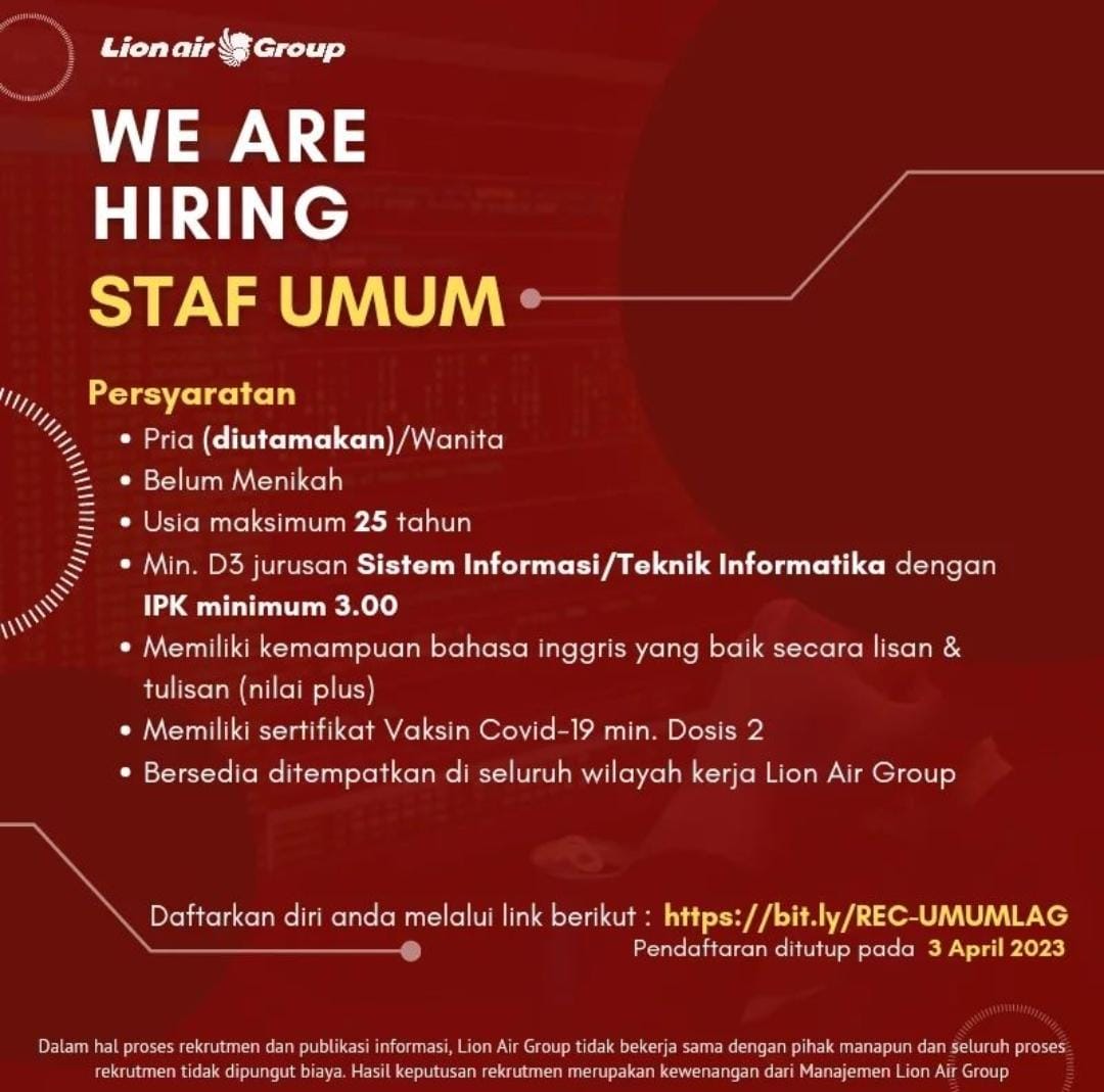 Infosumbar.net – Lion Air Group sedang membuka lowongan kerja untuk posisi Staf Umum.