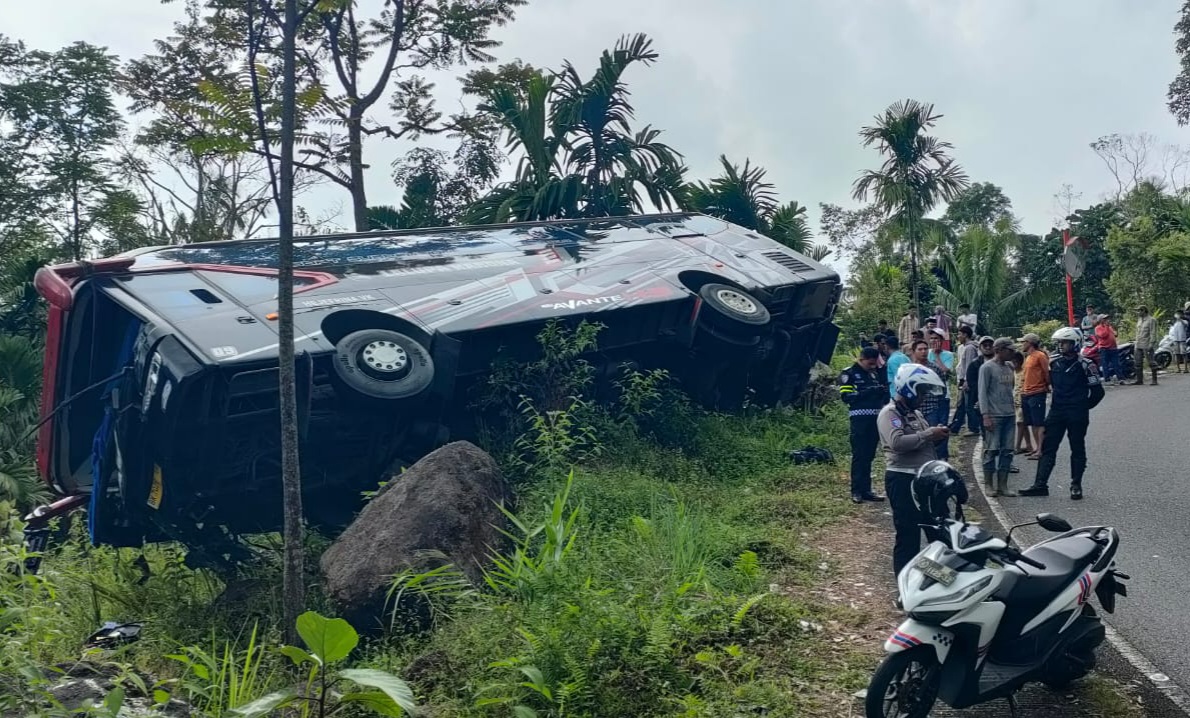 Infosumbar.net – Bus Pariwisata terguling di Malalak Selatan, Kecamatan Malalak, Kabupaten Agam, Minggu (6/4/2025) pukul 12.00 WIB.