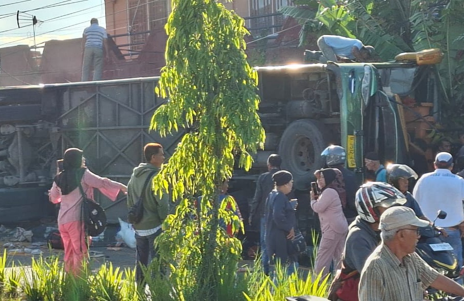 Menurut Tri Desyu, bus nopol B 7512 FGA alami rem blong. Bus terbalik setelah mengantam pagar rumah warga di sisi kiri jalan.