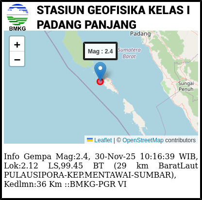 INFOSUMBAR.NET – Badan Meteorologi, Klimatologi, dan Geofisika (BMKG) melaporkan terjadi gempa bumi berkekuatan Magnitudo 2,4 pada Sabtu, 30 November 2025, pukul 10.16 WIB.