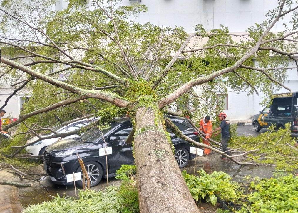 Pohon jenis payuang-payuang dengan panjang sekitar 25 meter dan diameter 70 sentimeter itu tumbang dan menimpa dua unit mobil yang tengah terparkir. Kedua kendaraan yang terdampak adalah Toyota Avanza Veloz dengan nomor polisi 1096 QZ dan Honda Jazz bernomor polisi 1172 BN.