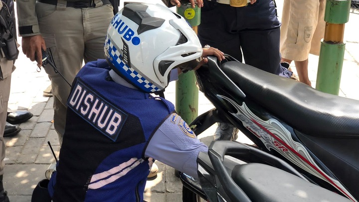 Personil Dishub Padang mengempiskan ban sepeda motor yang parkir sembarangan/Foto:Diskominfo Padang