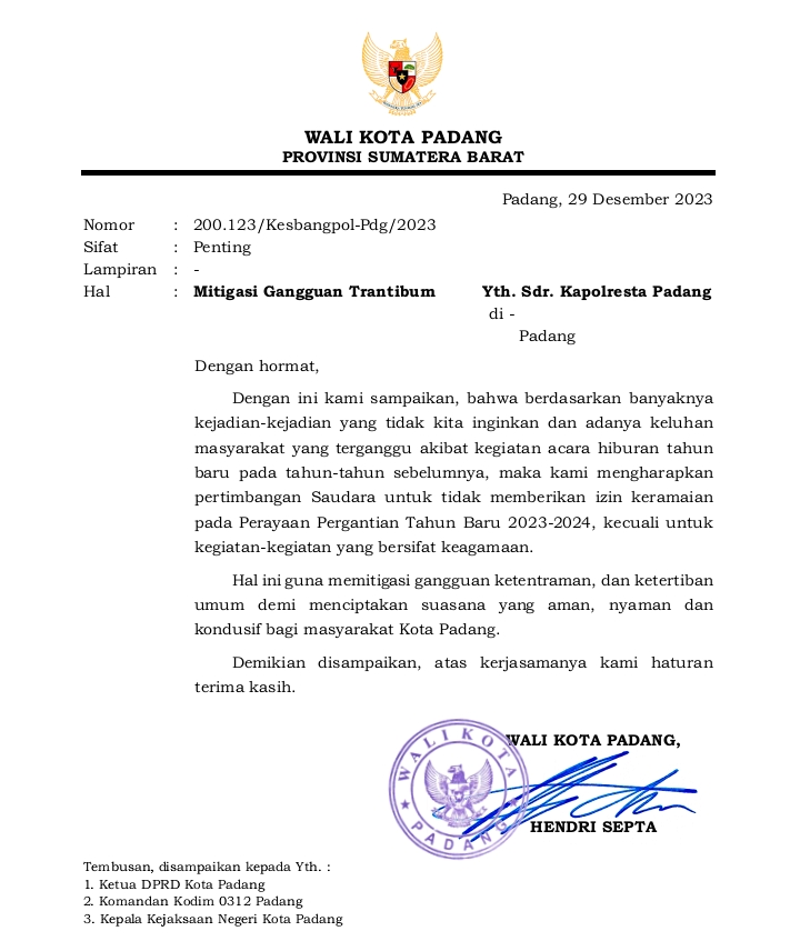 “Hal ini guna memitigasi gangguan ketentraman, dan ketertiban umum demi menciptakan suasana yang aman, nyaman dan kondusif bagi masyarakat Kota Padang,” tulisnya lagi. (Bul)