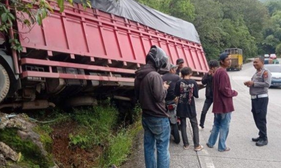 Akibat benturan dengan tebing, truk mengalami kerusakan ringan pada bagian depan kendaraan. Pihak kepolisian telah melakukan olah tempat kejadian perkara dan mengatur lalu lintas agar tidak terjadi kemacetan di lokasi kejadian.(Bul)