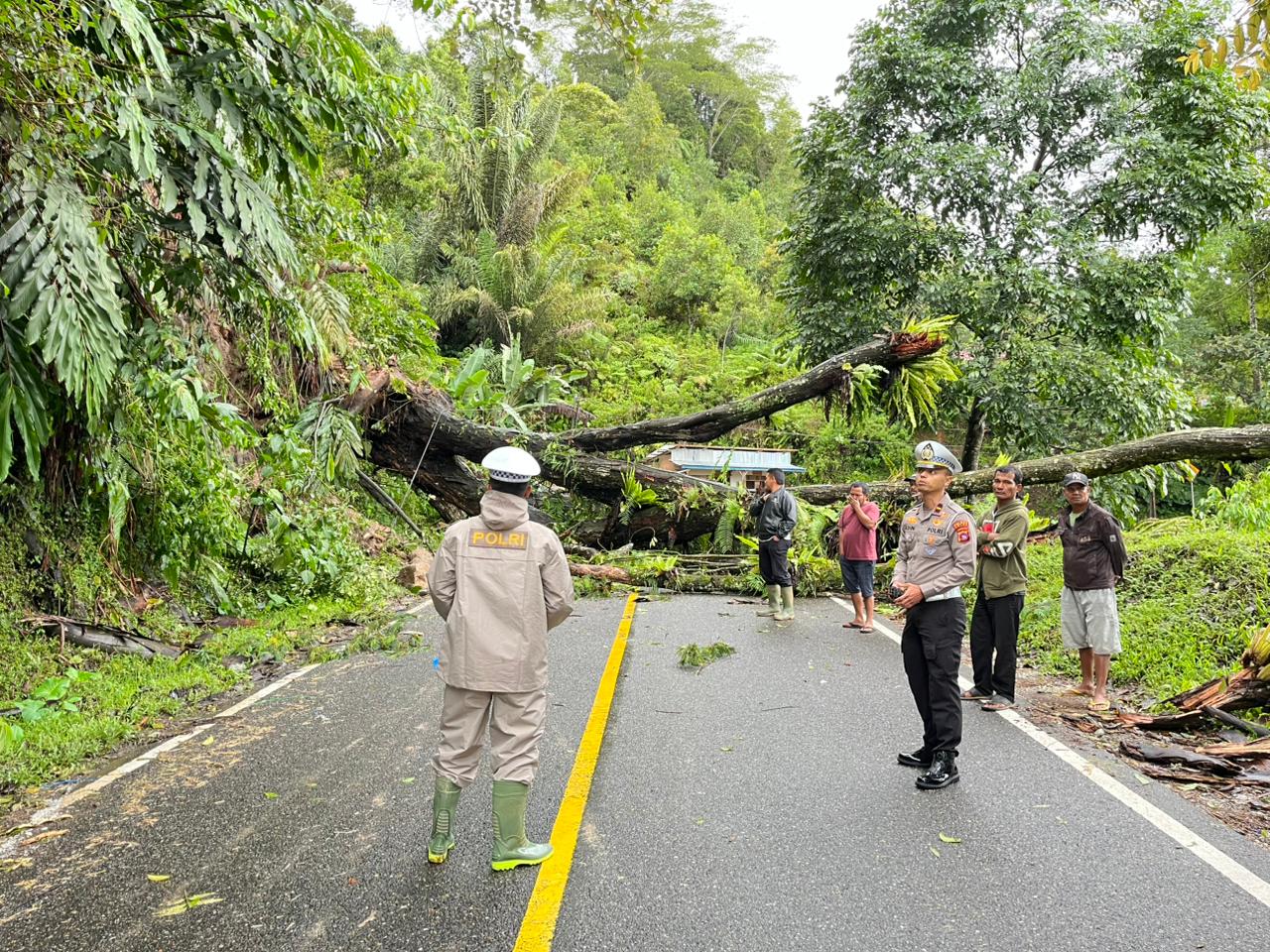 Setelah sebelumnya akses jalan longsor dan menutupi badan jalan, hingga sudah bisa dilewati oleh kendaraan, pagi ini, pohon tumbang menutup akses jalan sehingga tidak bisa dilewati oleh kendaraan roda dua maupun roda empat.