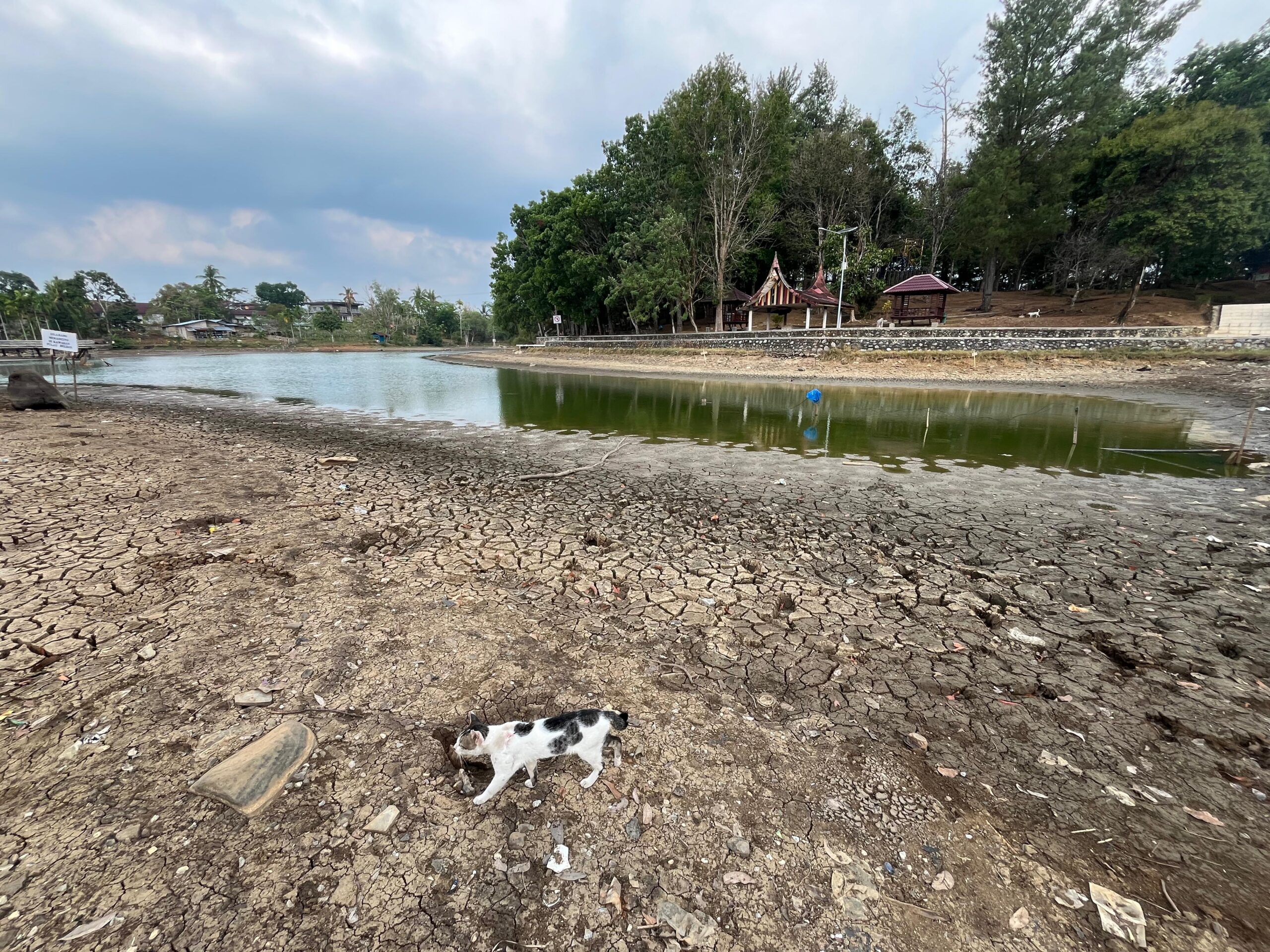 Tampak permukaan air danau menyusut drastis hingga lebih kurang 10 meter, sehingga terlihat permukaan tanah yang kering dan retak-retak.