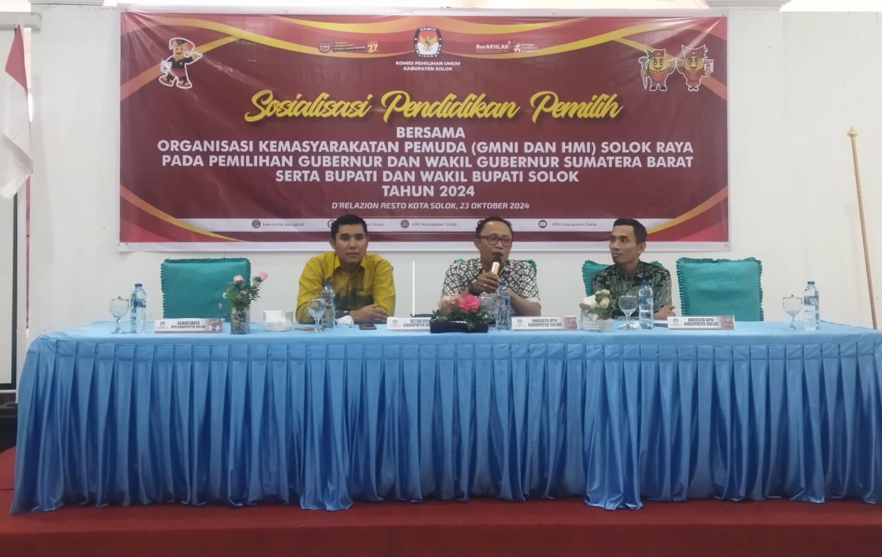 Infosumbar.net – Komisi Pemilihan Umum (KPU) Kabupaten Solok menggelar sosialisasi pendidikan pemilih bersama organisasi kemasyarakatan pemuda (GMNI dan HMI) Solok Raya untuk Pilkada 2024 pada Rabu (23/10/2024).
