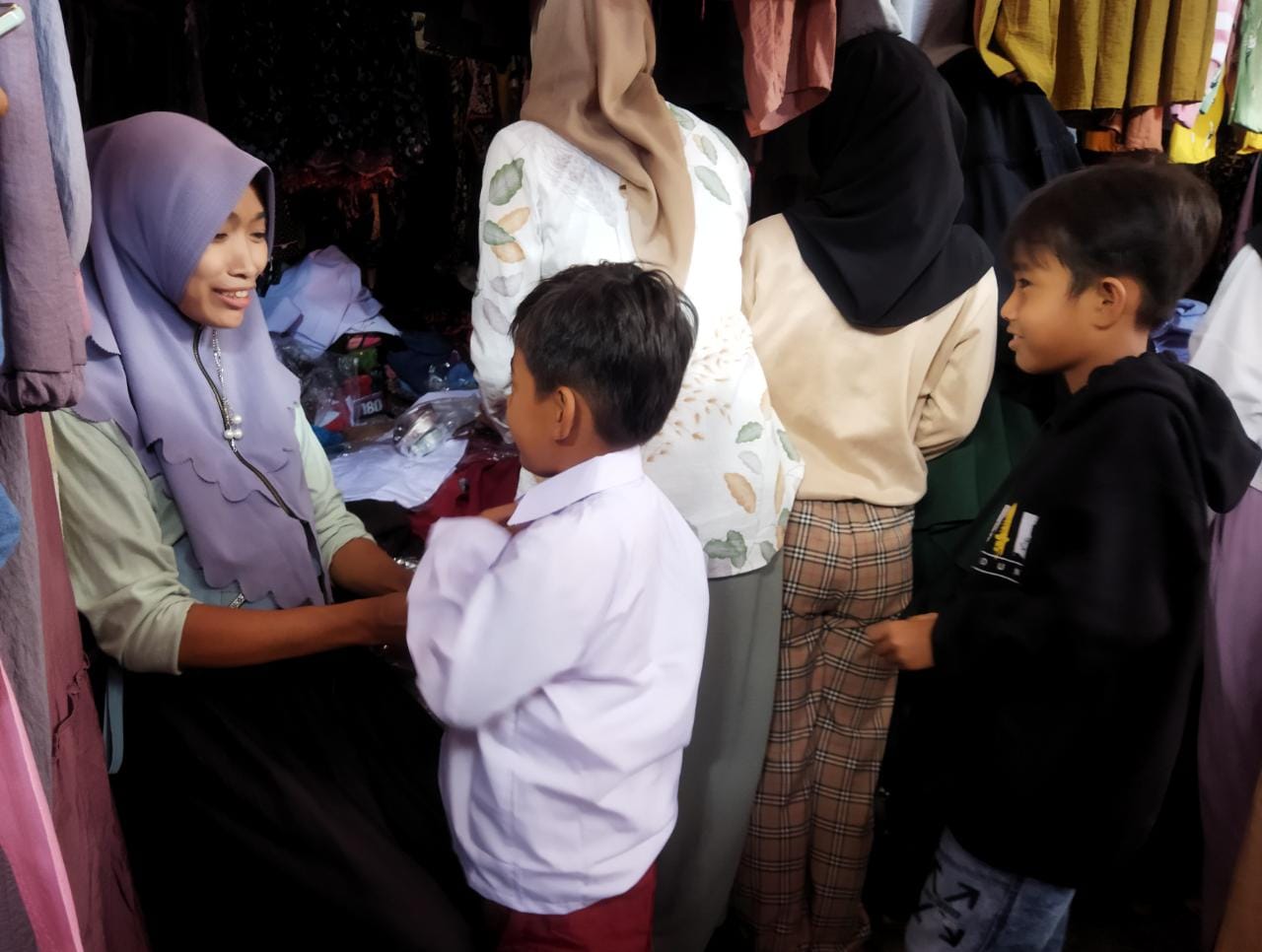 Orang tua sengaja datang membeli pakaian bersama anaknya, agar ukuran seragam dapat disesuaikan dengan ukuran tubuh si anak.