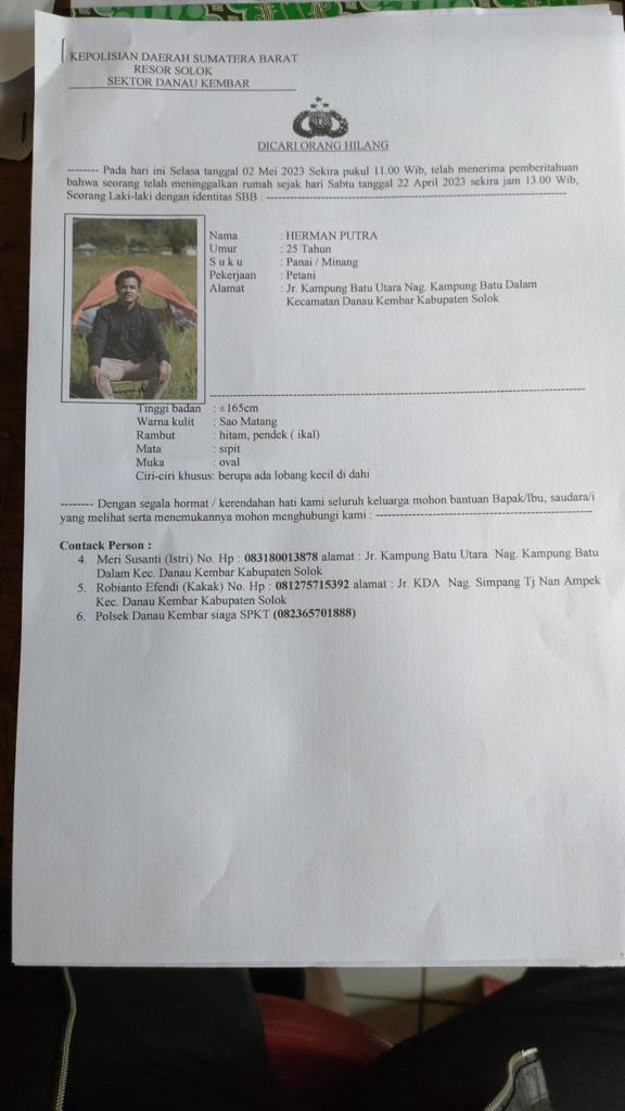 Kapolsek Danau Kembar, IPTU Irhas Murat, mengatakan, warga yang dilaporkan hilang tersebut adalah Herman Putra (25) yang berprofesi sebagai petani.