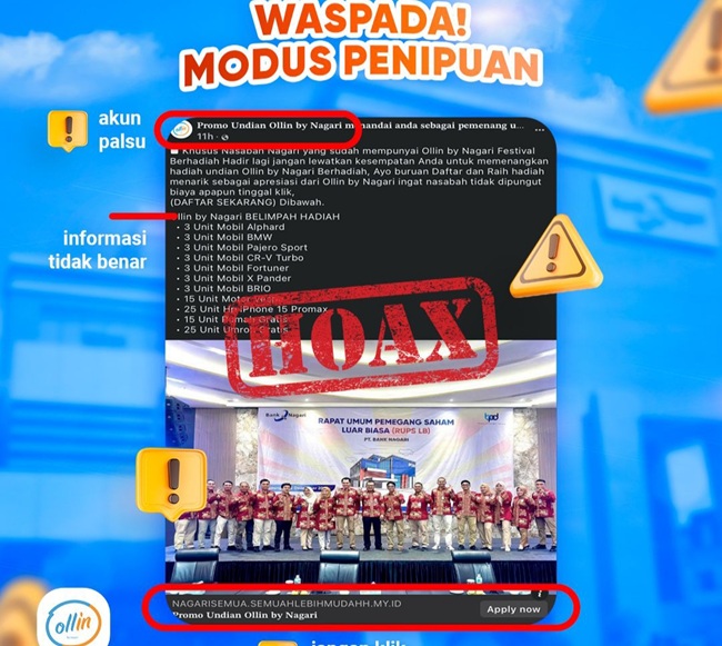 Dalam beberapa hari terakhir, sejumlah unggahan yang mencatut nama dan logo Bank Nagari ramai beredar di media sosial. Akun palsu itu menyebarkan tautan mencurigakan yang menjanjikan hadiah menggiurkan seperti mobil, uang tunai, hingga paket umrah. Beberapa di antaranya menggunakan nama program fiktif seperti “OLLIN” atau “tabungan berhadiah”.