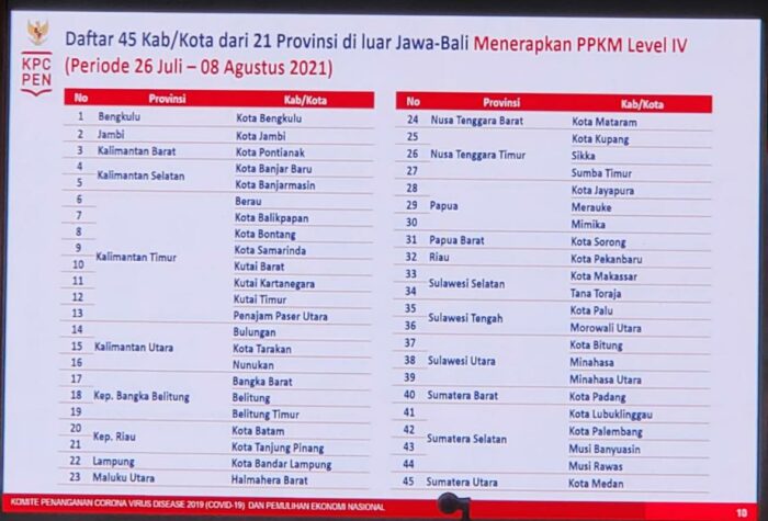 Pemerintah secara resmi telah mengganti istilah PPKM Darurat dengan istilah PPKM Level 4 yang tertuang dalam Instruksi Menteri Dalam Negeri (Inmendagri) Nomor 22 Tahun 2021 tentang Pemberlakuan Pembatasan Kegiatan Masyarakat Level 4 Covid-19 di wilayah Jawa dan Bali.