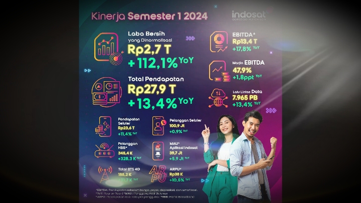 Pada 1H2024, Indosat mempertahankan pertumbuhan pendapatan total dua digit yang meningkat sebesar 13,4% year-on-year (YoY) menjadi Rp27.976,3 miliar.