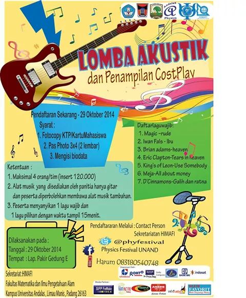 <img class="alignnone size-full wp-image-16625" src="http://www.infosumbar.net/wp-content/uploads/2014/10/IMG_74171637901147.jpeg" alt="IMG_74171637901147" width="480" height="580" /> Buat kamu yang hobi musik, nyanyi. Silahkan ikut Lomba Akustik Physics Festival 2014. Don't miss it!!!!...