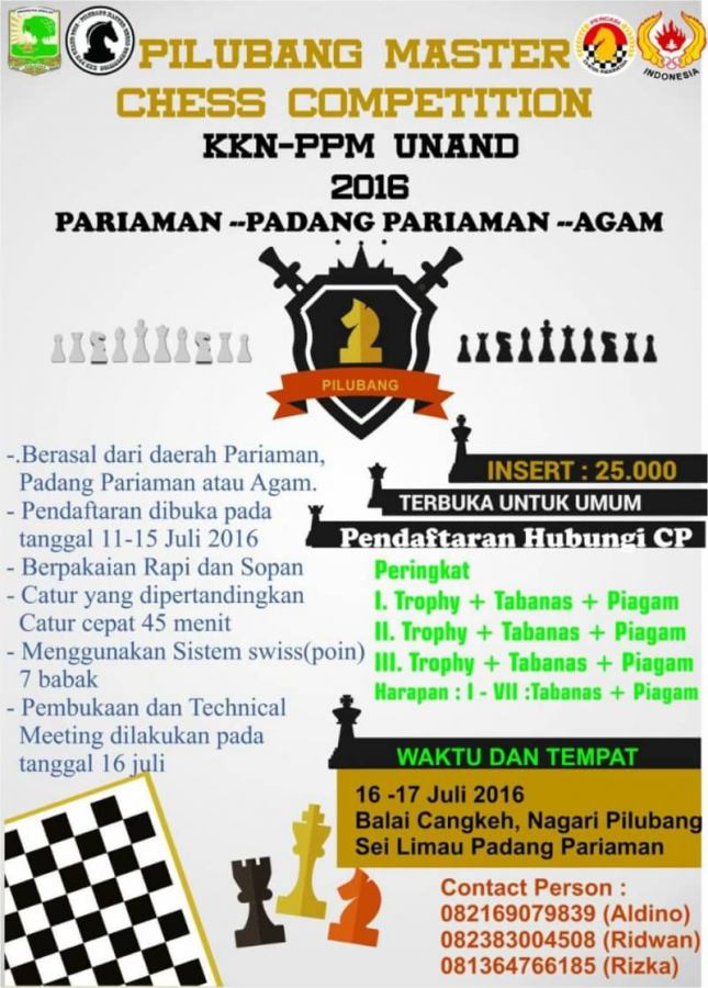 Kejuaraan ini khusus untuk daerah Kabupaten Padang Pariaman, Kota Pariaman, Kabupaten Agam. Kejuaraan catur ini terbuka untuk umum, yang di adakan pada tanggal 16 – 17 Juli 2016 di Balai Cengkeh, Nagari Pilubang, Sungai Limau, Padang Pariaman.