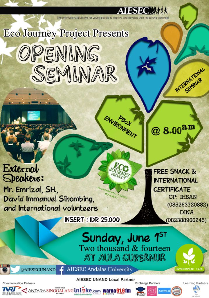 AIESEC UNAND adakan Proyek Nasional Berbasis Lingkungan, Eco Journey Project. Sebagai organisasi internasional yang bertujuan menciptakan perdamaian dan mengembangkan potensi manusia, AIESEC UNAND tidak pernah bosan untuk mengadakan berbagai kegiatan yang memberikan dampak positif kepada masyarakat. Salah satu kegiatan yang akan dilakukan selama bulan Juni-Juli 2014 adalah bertemakan lingkungan, Eco Journey Project, yang merupakan national project sekaligus Project Based on Exchange (PBOX) (baca: piboks) yang diadakan oleh AIESEC di Indonesia di 11 tempat, yaitu UNAND, UI, Binus, Prasmul, UPNV Yogyakarta, UGM, UNDIP, UNIBRAW, UNS, Bandung, dan Surabaya.