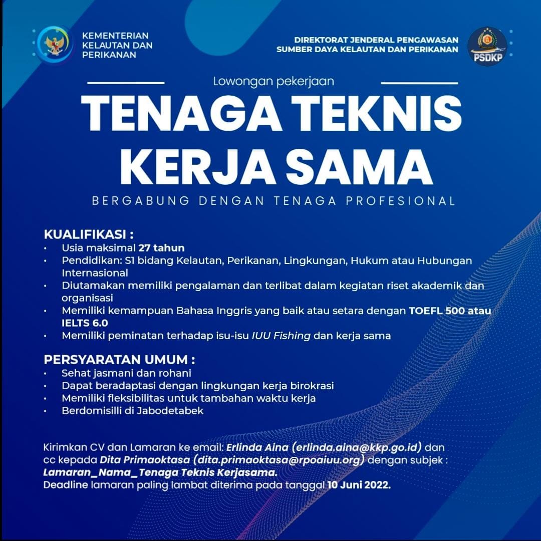 Infosumbar.net – Kementerian Kelautan dan Perikanan (KKP) Direktorat Jenderal Pengawasan Sumber daya Kelautan dan Perikanan membuka lowongan pekerjaan untuk posisi tenaga teknis kerjasama, adapun kualifikasinya di antaranya berusia 27 tahun, pendidikan S1 bidang kelautan, perikanan, lingkungan, hukum, atau hubungan internasional.