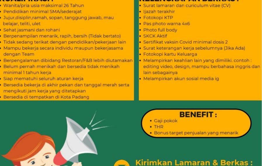 Calon pelamar tidak terikat dengan pendidikan atau pekerjaan lain, mampu bekerja secara tim maupun dengan tim, berpengalaman di bidang restoran atau F&B lebih diutamakan, belum menikah dan bersedia tidak menikah minimal 1 (satu) tahun kerja, memiliki handphone android atau IOS, siap mematuhi seluruh aturan kerja, bersedia bekerja di akhir pekan dan tanggal merah sera mengikuti jam kerja yang telah ditetapkan, dan bersedia ditempatkan di Kota Padang.