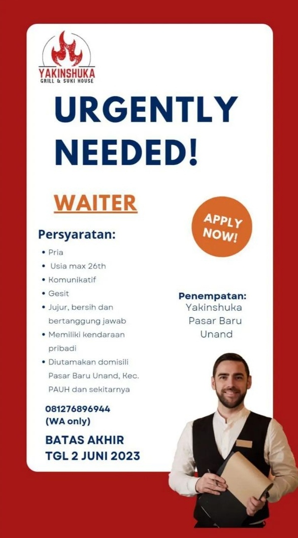 Infosumbar.net – Yakinshuka Grill and Suki House sedang membuka lowongan pekerjaan sebagai Waiters, untuk penempatan Pasar Baru, Unand.