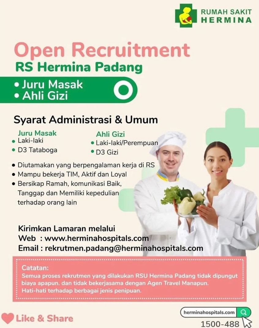 Infosumbar.net – Rumah Sakit Hermina Padang sedang membuka lowongan pekerjaan sebagai Juru Masak dan Ahli Gizi.