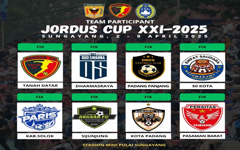 “Ya, 8 tim ini sudah menyatakan kesiapan mereka untuk tampil di Jordus Cup XXI tahun 2025 ini. Insya Allah, tim tim ini akan diperkuat pemain-pemain Liga Indonesia. Apalagi, Liga 2 dan 3 sudah menyelesaikan kompetisinya,” kata H. Yasman Yanusar, penggagas turnamen Jordus Cup kepada infosumbar, Jumat (7/3) malam.