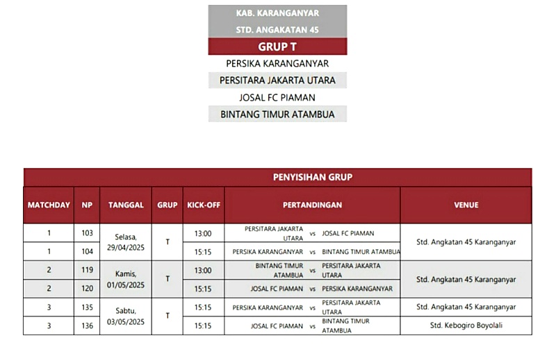 infosumbar.net – Josal FC Piaman akan mengawali langkah babak 32 besar nasional Liga 4 2024/2025, menghadapi Persitara Jakarta Utara di Stadion Angkatan 45, Karanganyar, Jawa Tengah, Selasa (29/4/2025) pukul 13.00 WIB.