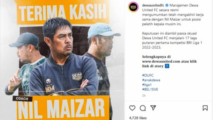 infosumbar.net – Manajemen Dewa United FC melalui laman resmi klub, secara resmi mengumumkan telah mengakhiri kerja sama dengan pelatih kepala musim ini, Nil Maizar, pada Rabu (28/12/2022).