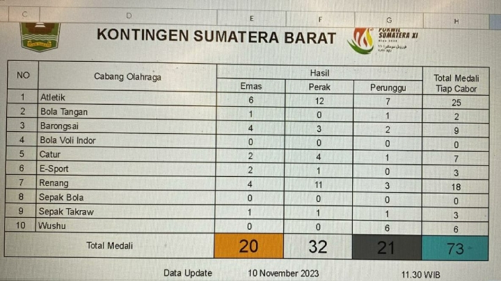 Koleksi medali kontingen Sumbar hingga Jumat siang (10/11) ini sebanyak 20 emas, 32 perak dan 21 perunggu dengan total 73 keping medali. Untuk sementara menempati peringkat ketiga klasmen pengumpulan medali Porwil Sumatera XI-2023 Riau.
